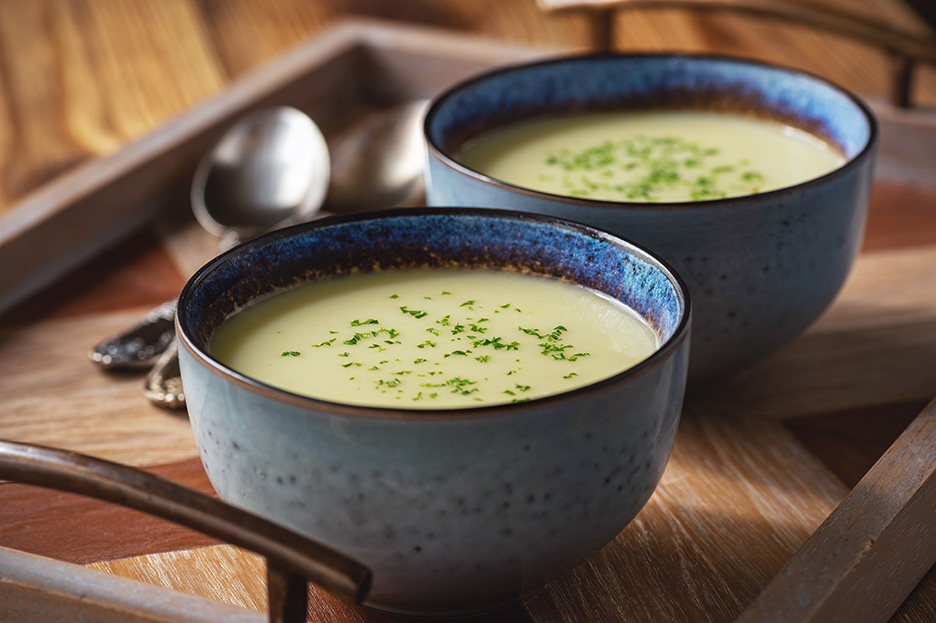 This is a very rich soup and is meant to be served in small bowls or glasses for sipping. To lower the fat content, omit the butter and the sautéing step. Simply add the onions, shallots, and leeks to the pot with the other ingredients and cook. You can also eliminate the cream and only use milk.